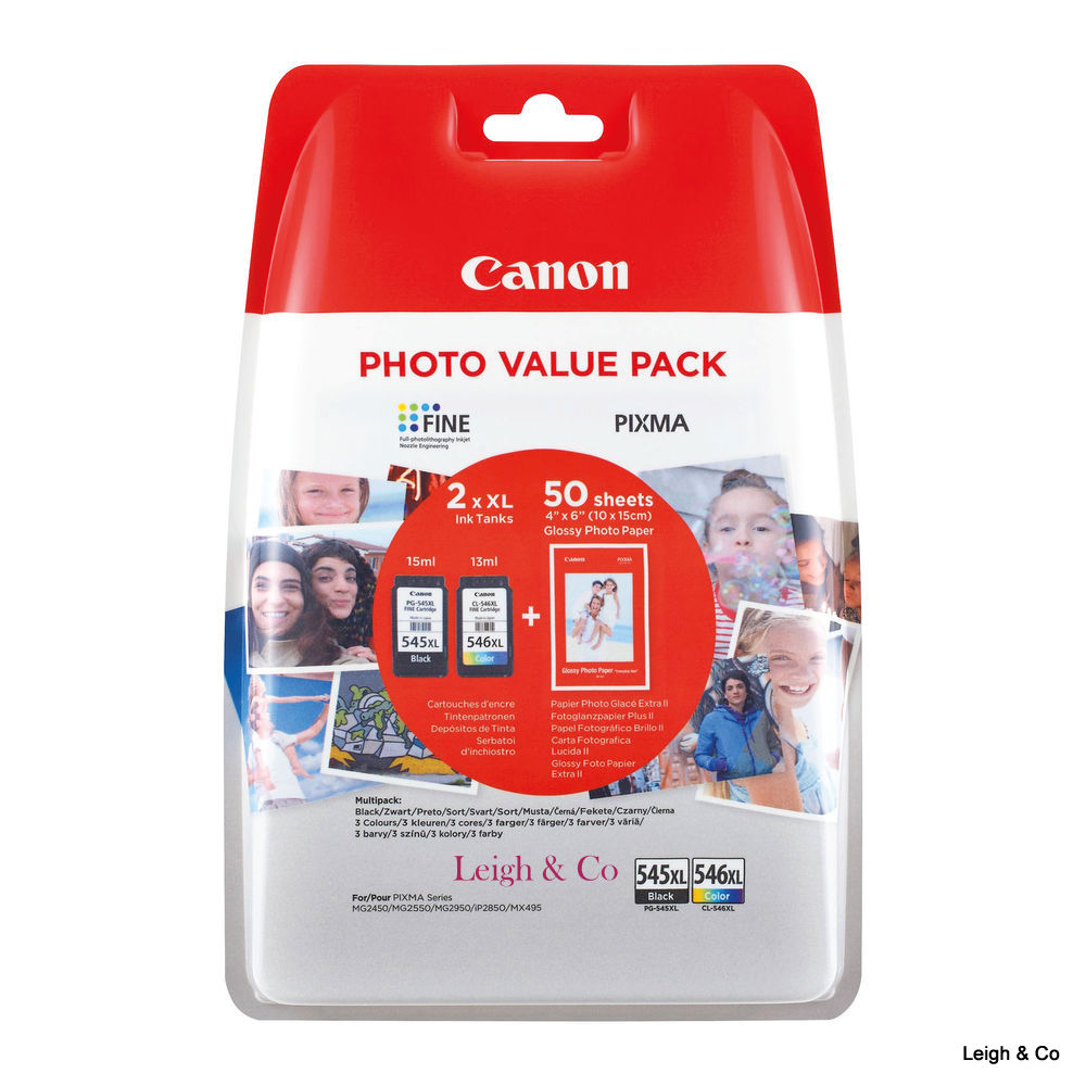 Save time and money with this Photo Value Pack from Canon. The PG-545XL and CL-546XL ink cartridges in Black and Colour are built to work with Canon’s FINE print head technology system which, when used with the included PP-501 Photo Paper, helps to create long lasting photographs and prolong the reliability of your printer. This pack contains enough ink and paper to create 50 first class prints.